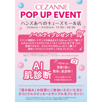 ●ノベルティプレゼントセザンヌのイベントを実施します!【開催場所】ハンズあべのキューズモール店外ブース【開催日時】2月3日(火)~2月12日(木)…...