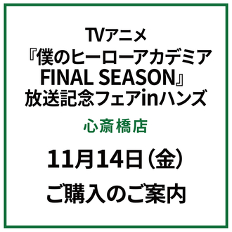 TVアニメ『僕のヒーローアカデミアFINALSEASON』放送記念フェアinハンズにつきまして、11月14日(金)10:00より9F店頭にて入場整…...