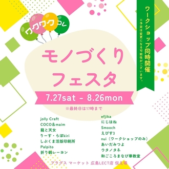 LECT2階プラグスマーケット広島LECT店伝え場にて『ワクワクコレモノづくりフェスタ』本日より開催いたします。開催期間:7月27日(土)〜8月2…...