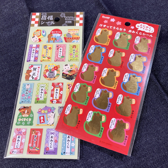 年賀状に貼って幸運も一緒に送っちゃおう!左:マインドウェイブ招福シールめくりくじうま税込352円右:サンリオ年賀シールJPN21-6税込385円...