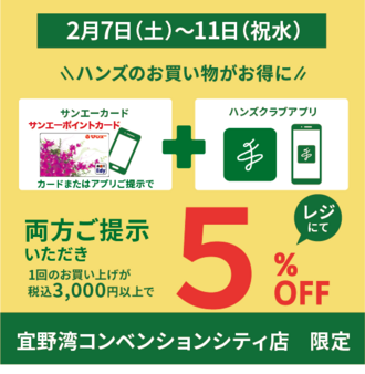 【宜野湾コンベンションシティ店限定】2月7日(土)~11日(祝水)の期間中サンエーカードまたはアプリ+ハンズクラブアプリ両方ご提示いただき1回のお…...