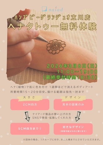 3月8日(日)に、ハンズビーグランデュオ立川店でナイアードのスタッフによるメヘンディ(ヘナタトゥー)が無料で体験できます!*メヘンディとは、ヘナと…...