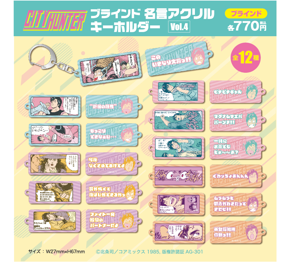 『シティーハンター』の主人公、冴羽獠を中心とする昭和でコミカルなセリフがアクリルキーホルダーに!