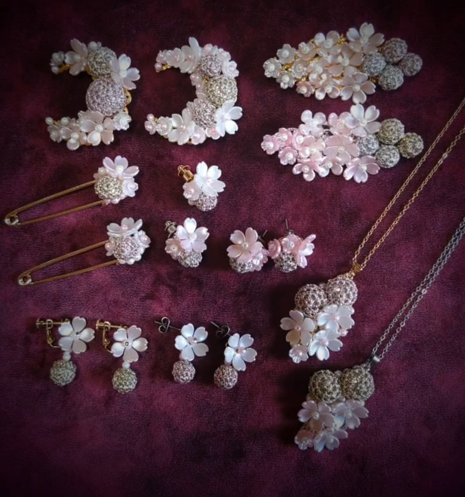 柔らかい輝きのラメ糸を手編みしたパーツと異素材を組み合わせたアクセサリー