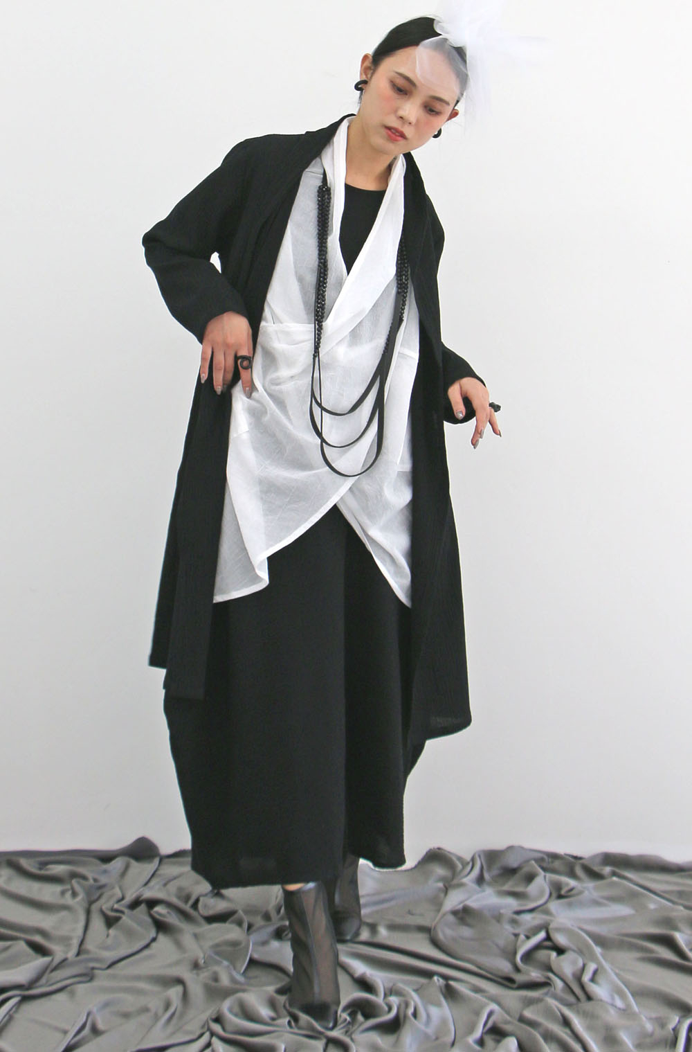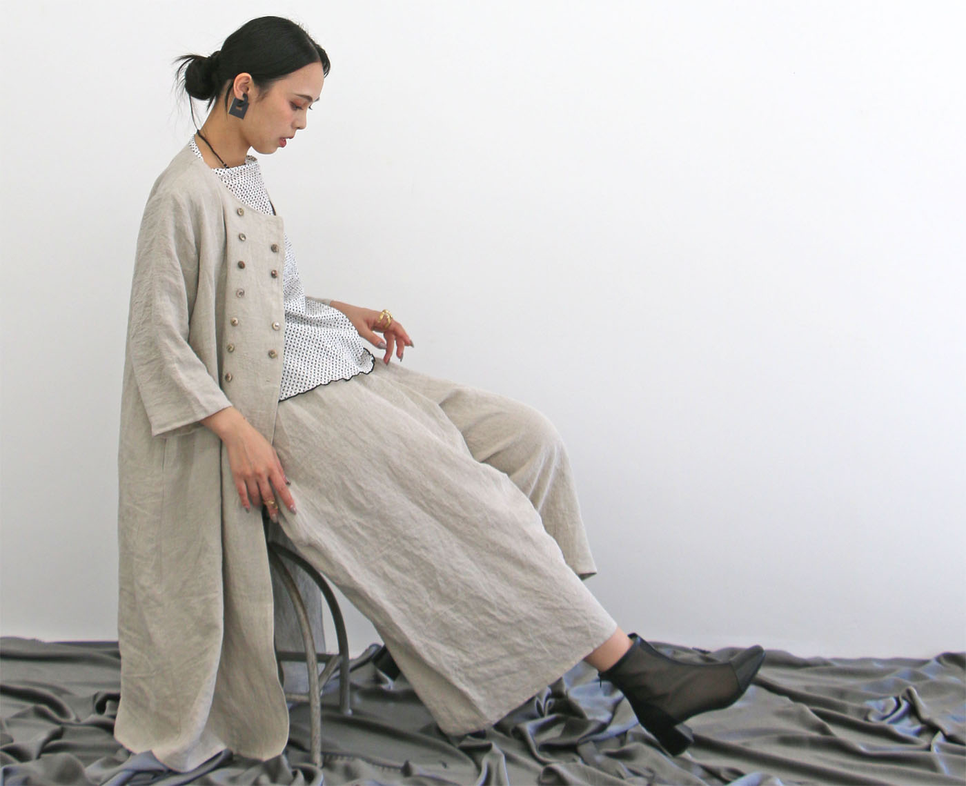 ワンピースにもなるコートにゆったりシルエットのパンツを合わせ